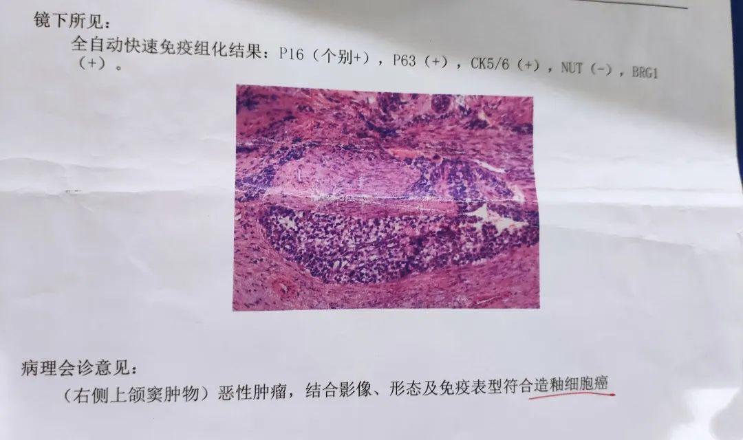 在当地一家大医院小华姐做了病检,病检结果提示:(右侧上领窦肿物) 恶性肿瘤,考虑牙源性癌/成秞细胞癌。这个结果让全家愁眉不展:“平常身体都挺好的,怎么就得了癌症呢?”之后的1个月,小华姐右侧鼻面部持续性出现肿胀感,局部也膨大起来,除此之外,她的心理压力也越来越大,辗转几家医院无果后来到仁品耳鼻喉医院寻求治疗。